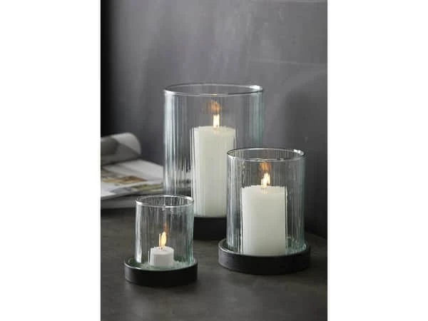 Skab en varm og hyggelig stemning med en hurricane med LED-lys fra BITZ i rustikt glas på en base af stentøj.
