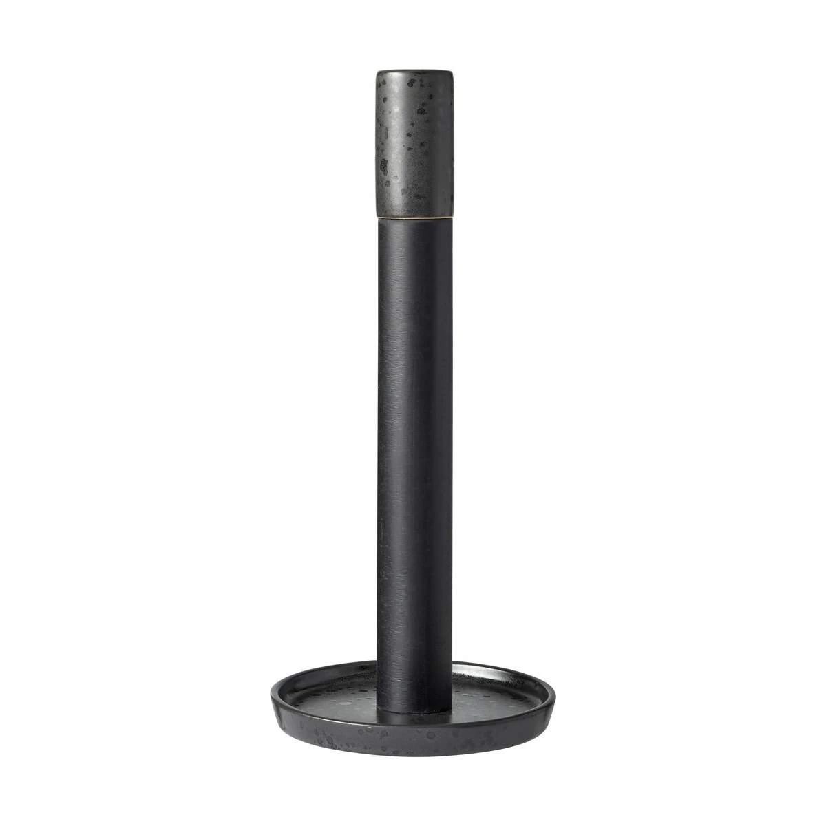 Toppen af køkkenrulleholderen er udformet i stentøj med reaktiv glasur, der matcher resten af Bitz stentøjsserie. Selve holderen er i egetræ og har en praktisk kant, der forhindrer papiret i at rulle sig ud.