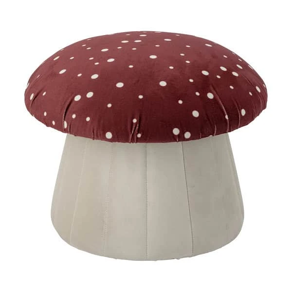 Puffen er lavet af polyester-stof og har en svampeform. Puffen kan både bruges som fodstøtte eller stol og har et fantastisk sødt rødt-hvidt mønster.