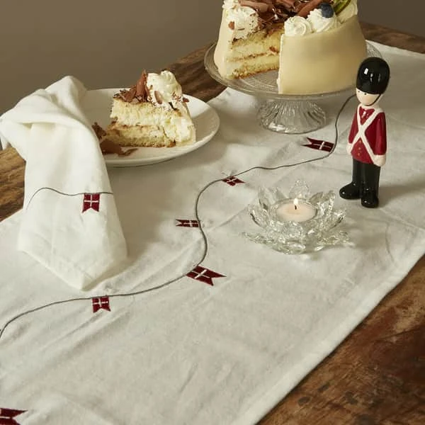 Forkæl fødselsdagsborddækning med Speedtsbergs bordløber med broderede flag. Denne festlige og bæredygtige løber er den perfekte tilføjelse til enhver fødselsdagsfest.