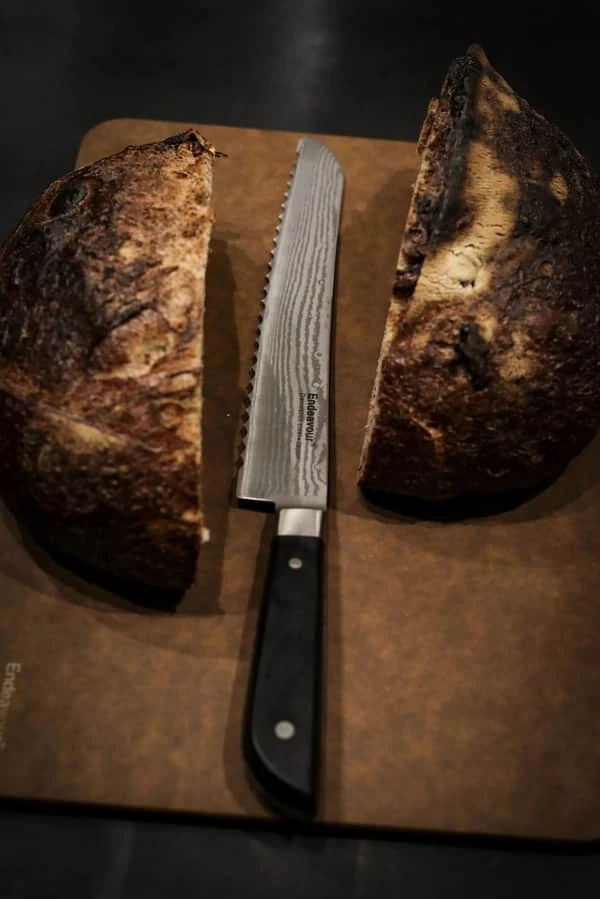 Endeavour brødkniv Bread er lavet til at skære lettest muligt igennem alle typer brød og de lidt hårdere fødevarer. Derfor er der lavet en smal klinge af skarpt Damaskus-stål og udstyret kniven med takker som hjælper kniven til at få godt fat.