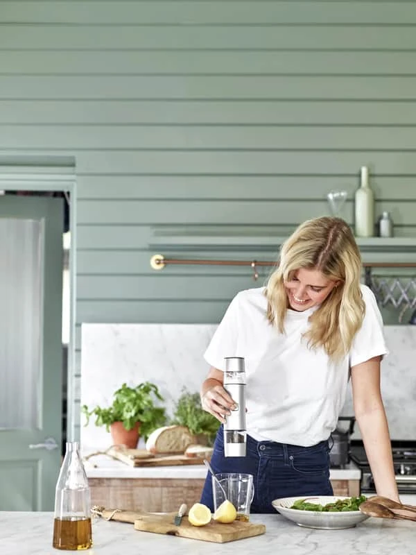 Kværnen kræver ikke batterier, men oplades blot i den medfølgende ladestander, som tilmed er elegant i sit udtryk og fint kan flytte ind på en fast plads i køkkenet.