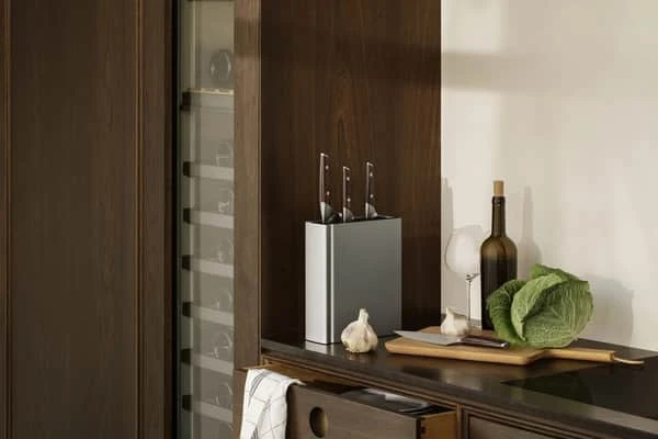 Knivblokkens fleksible design gør knivene tilgængelige både skråt fra og lige oven fra, og blokken kan derfor også placeres under et overskab.
