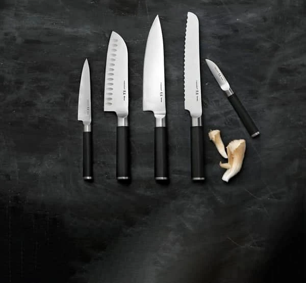 Du får 1 knivblok med 5 knive: 1 urtekniv, 1 japansk urtekniv, 1 santokukniv med luftskær, 1 kokkekniv og 1 brødkniv.