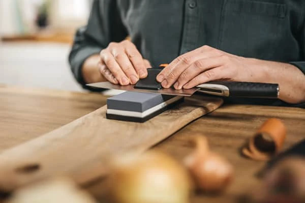 Når du sliber dine knive med en vådsten, er det vigtigt at den lægges i vand inden brug, hver gang. Dernæst placeres kniven i holderen, der sikrer den rigtige slibevinkel og når kniven er slebet, poleres den med læderet.