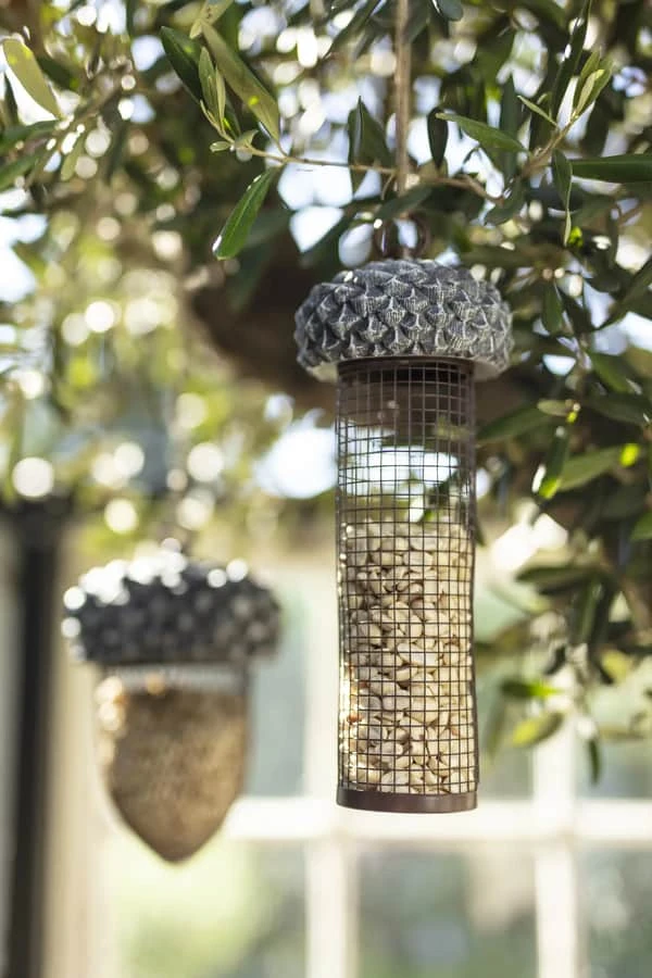 Flot Agern foderautomat fra CASA Living hænger perfekt i træet med mad til havens dyr.