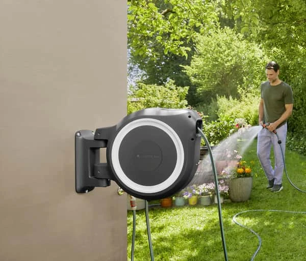 Gør det nemt og vær altid klar til vanding i haven med den vægmonterede slangeboks RollUp M fra Gardena, hvor du ubesværet kan vande haven.