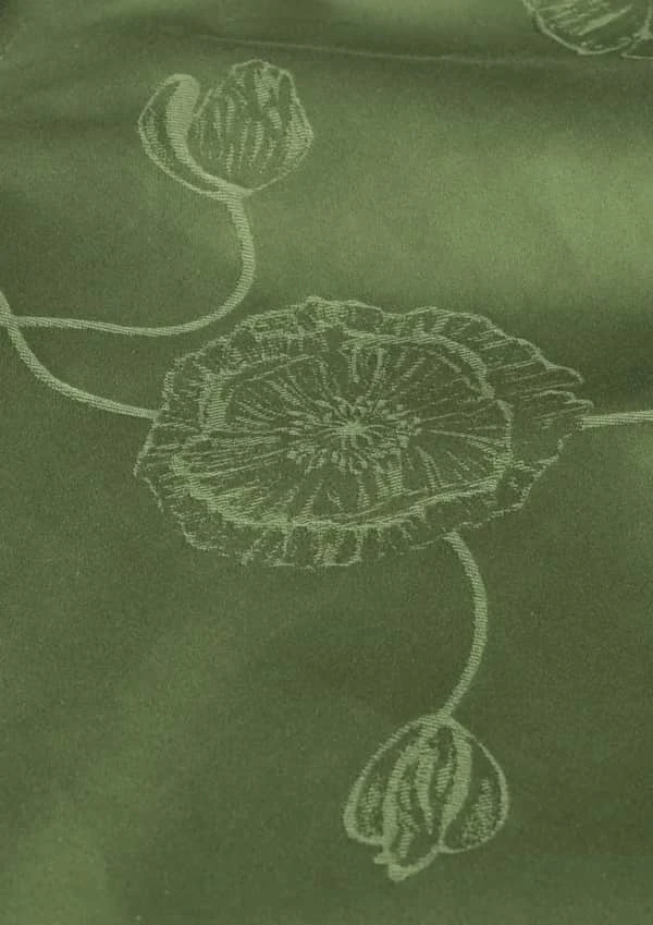Valmuer snirkler sig let og elegant hen over dugen, hvilket skaber en underspillet poetisk look, som kan styles i både klassisk eller romantisk stil.
