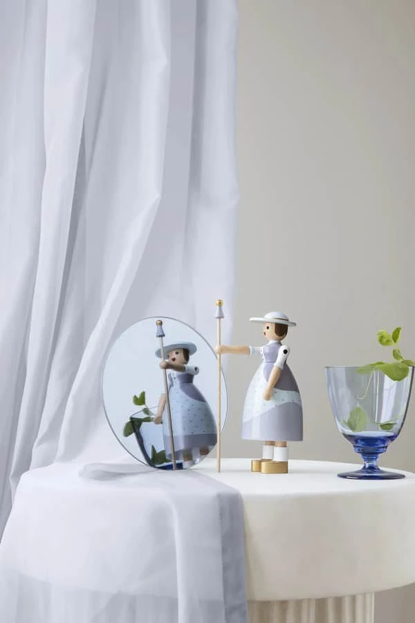 Kay Bojesens hyrdinde ser helt eventyrlig ud med forgyldte sko, en hat med gulddetaljer og hyrdestav. Hendes hjerteformede mund understreger hendes sødme og uskyldighed.