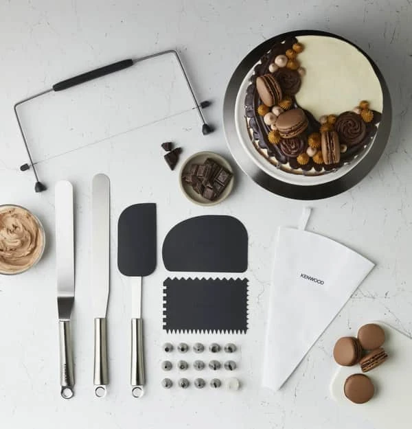 Med Kenwoods kagedekoration sæt kan du dekorere dine mesterværker som en ægte mesterbager. Du får nemlig et sæt med alt, du skal bruge for at skabe kreative dekorationer på dine kager med et professionelt udtryk. Med alt fra 14 forskellige tyller, et dreje kagefad, sprøjtepose, lagkageskærer og spartler er der ikke dét, du ikke kan skabe.