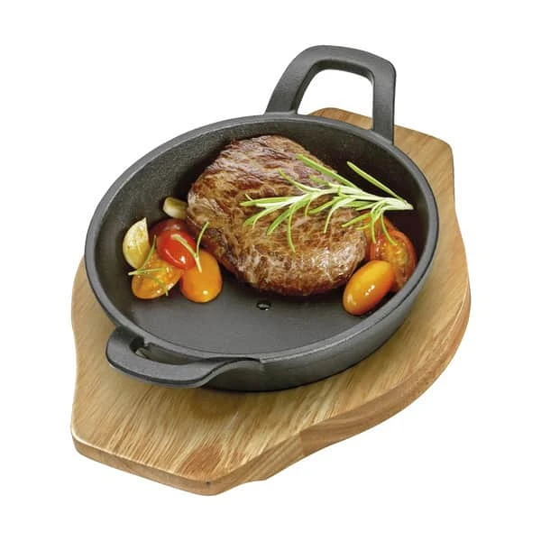 Brug støbejernspanden, som et alternativ til engangsbakker af aluminium. Panden kan også bruges på komfuret og i ovnen. Panden kommer med et bræt af fyrretræ, som er ideelt til servering. En fordybning i brættet holder panden på plads, så du ikke skal tænke på om den glider af brættet. Støbejernspanden og brættet måler 18,5 x 24 x 5,5 cm.