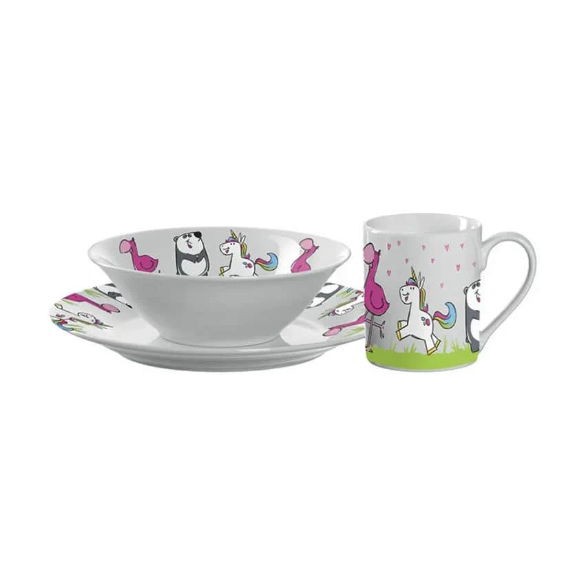 Sødt og flot børneservicessæt fra Leonardo som består af en tallerken, skål og et krus med dyremotiv i form af en enhjørning, flamingo og panda. Lad de nye bordkammerater flytte ind for dine små, og gør det sjovt at spise sammen til en masse dyr!