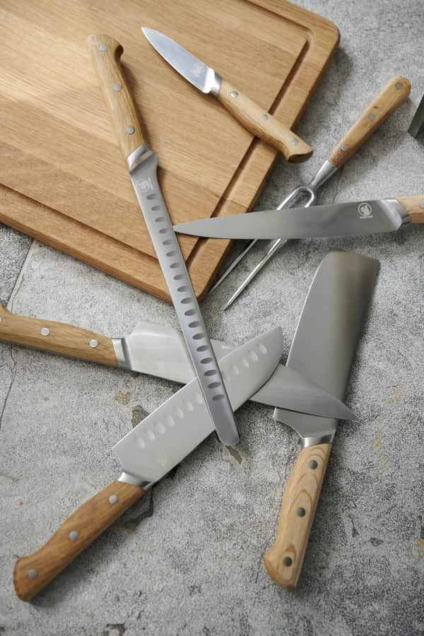 Både gaflen og knivbladene er fremstillet i rustfrit stål og håndtagene er olieret eg, som ved brug vil udvikle patina og blot blive smukkere, jo mere sættet bruges. Alle træhåndtagene er behagelige at holde op. Santokuknivens blad er designet med luftskær, der sørger for, at det afskårne ikke sætter sig fast på bladet.