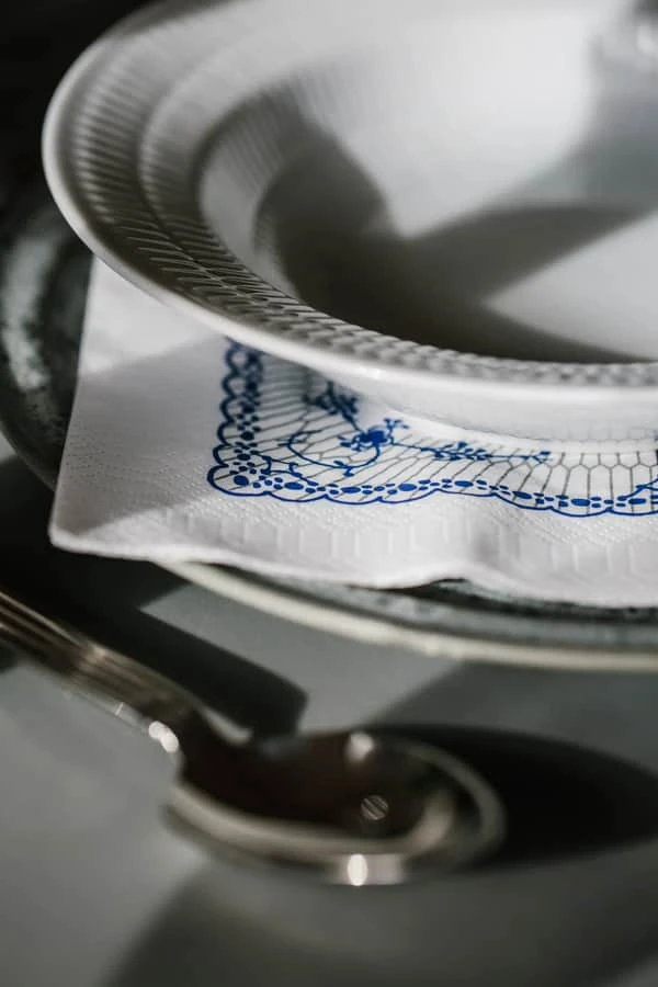 Gør din borddækning ekstra indbydende med de flotte blå musselmalet frokostservietter fra Kunstindustrien.