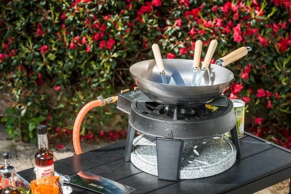 Du kan nemt justere og fordele varmen på dit HOT WOK PRO gasblus via tre individuelle haner. Du kan justere varmen direkte under wokken, på siderne af wokken eller under hele wokken. Udformningen af blusset giver wokken den perfekte placering over ilden. Til gasblusset medfølger den perfekte HOW WOK rundbundet Wokpande med en diameter på 30 cm og træhåndtag. Gasblusset er CE godkendt og udelukkende til udendørs brug.