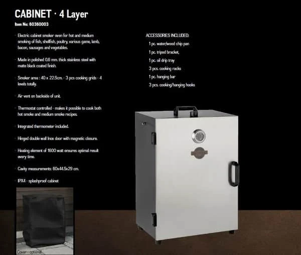 Med denne kompakte kabinet rygeovn med trinløs termostatstyring kan du tilføre et ekstra twist til din grillfest og med garanti sætte mundvandet i gang hos dine sultne gæster. Du kan bruge kabinet røgeovnen til at varmryge alverdens madvarer.