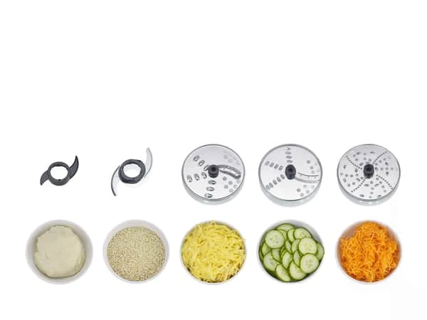 Kværnen lader dig finmale nødder, krydderier eller kaffebønner. Og dejkrogen gør det muligt at ælte brød, pizzadej eller anden dej jævnt, imens piskeskiven lader dig piske fløde, æggehvide eller mousse op til lækre kager.