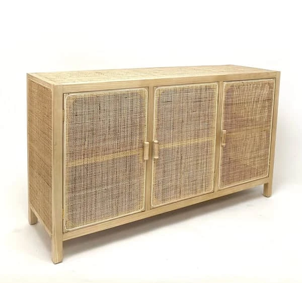 Sænken er lavet af teaktræ og rattan, der passer perfekt ind i en enkel nordisk stil. Stil skænken i stuen til opbevaring af stel, bløde plaider og smukke vaser. Skænken er med 3 låger og måler 85 x 150 x 45 cm.