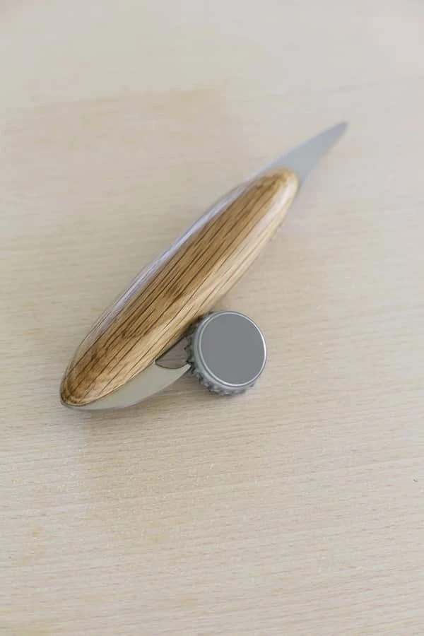 Spring Birds øloplukkeren er fremstillet i rustfrit stål og egetræ.