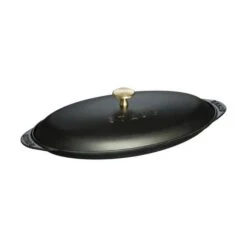 Elegant fiskefad fra Staub. Låget er udstyret med en særlig struktur indvendigt, som er med til at fordele den opsamlede damp tilbage over maden. Flottere fiskefad findes ikke.