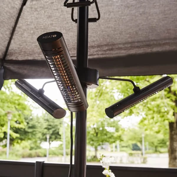 Når du nyder en dejlig stund på terrassen, så kan det være ekstra dejligt med lidt lun luft fra terrassevarmeren her fra Heat1, der er nem at montere under parasollen.