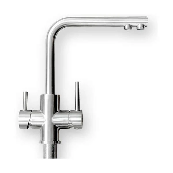 3-vejs hanen i rustfrit stål kan du erstatte med din eksisterende hane, så du slipper for at bore et ekstra hul i bordpladen, for at få plads til hanen. Vandhanen er meget let at bruge, da den fungerer som en normal hane med håndtag til både varmt og koldt vand.